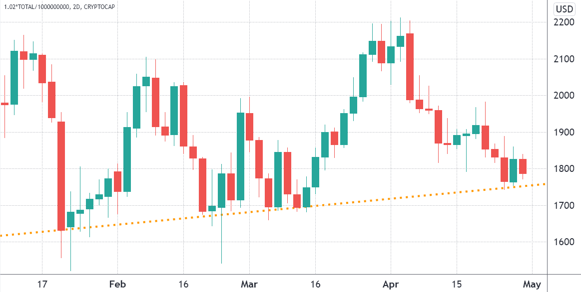 The total crypto market capitalization has been holding a slightly ascending trend for the past 3 months and the $1.75 trillion support was most recently tested on April 27 as Bitcoin (BTC) bounced at $38,000 and Ether (ETH) at $2,800 on April 27.