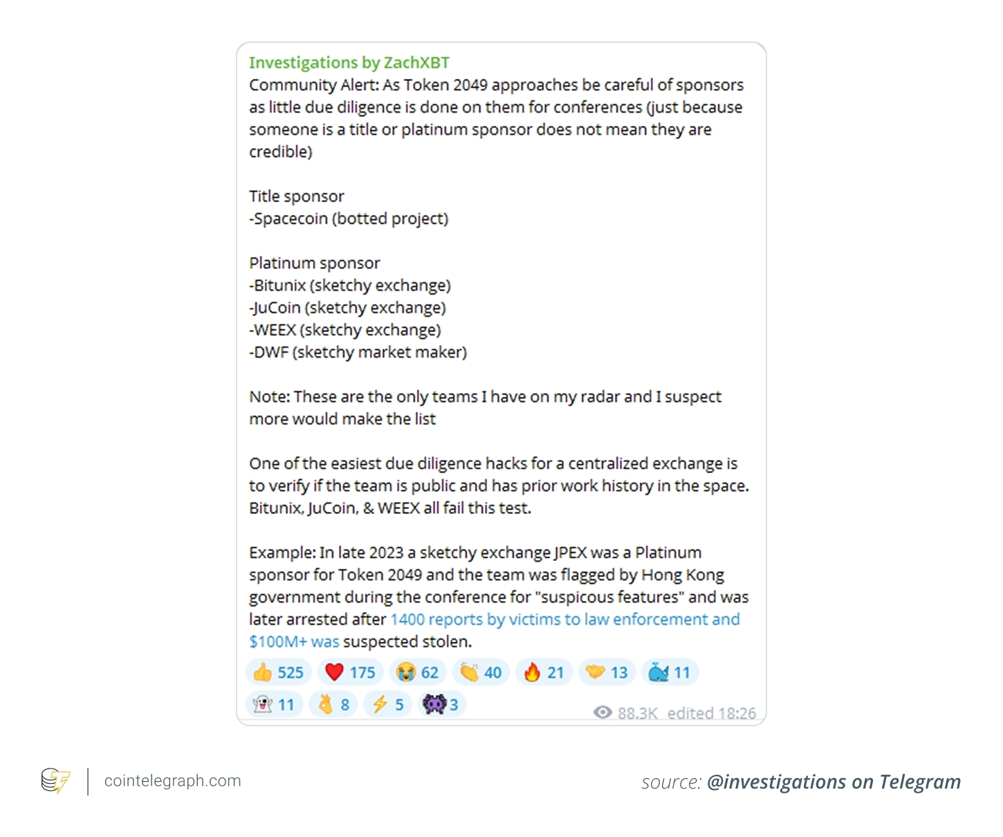 ZachXBT, a well-known crypto sleuth, made some observations via his Telegram channel on a few sponsors of Token2049, a major crypto event. He felt the organizers of such events do little due diligence on their sponsors and that a project being a platinum sponsor doesn’t increase credibility. He went on posting on his channel about sketchy Token2049 sponsors.