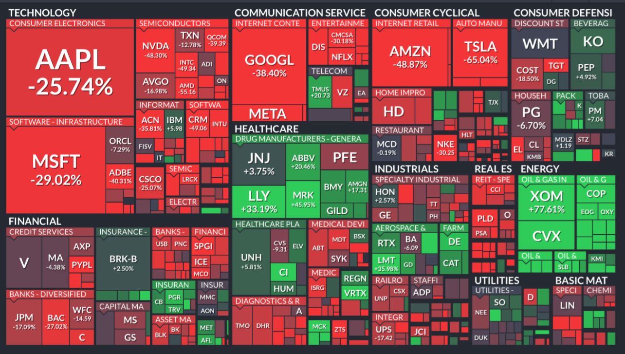 Major company stocks also performed poorly this year, which includes Apple (-25%), Microsoft (-29%), Google (-38%), Amazon (-49%), Netflix (-51%), Meta (-65%) and Tesla (-65%).