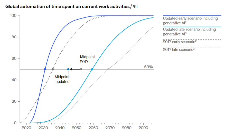 McKinsey explained that its broad range of 2030-2060 was made to encompass a range of outcomes — such as the rate at which generative AI is adopted, investment decisions and regulation, among other factors.
