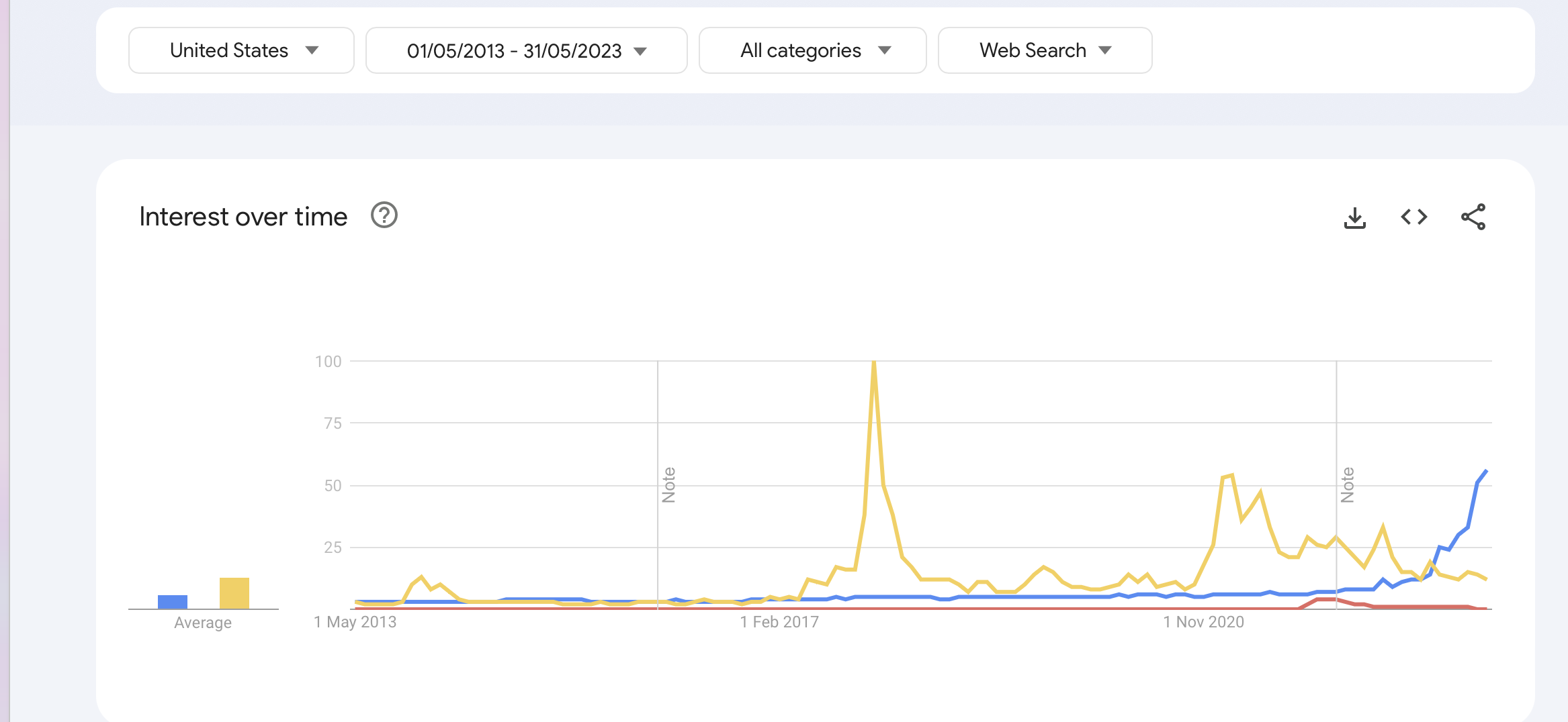In November 2013, Bitcoin surpassed AI as a search time in China for the first time, coinciding with it reaching its highest-ever level of $300 on the now-defunct cryptocurrency exchange Mt. Gox.