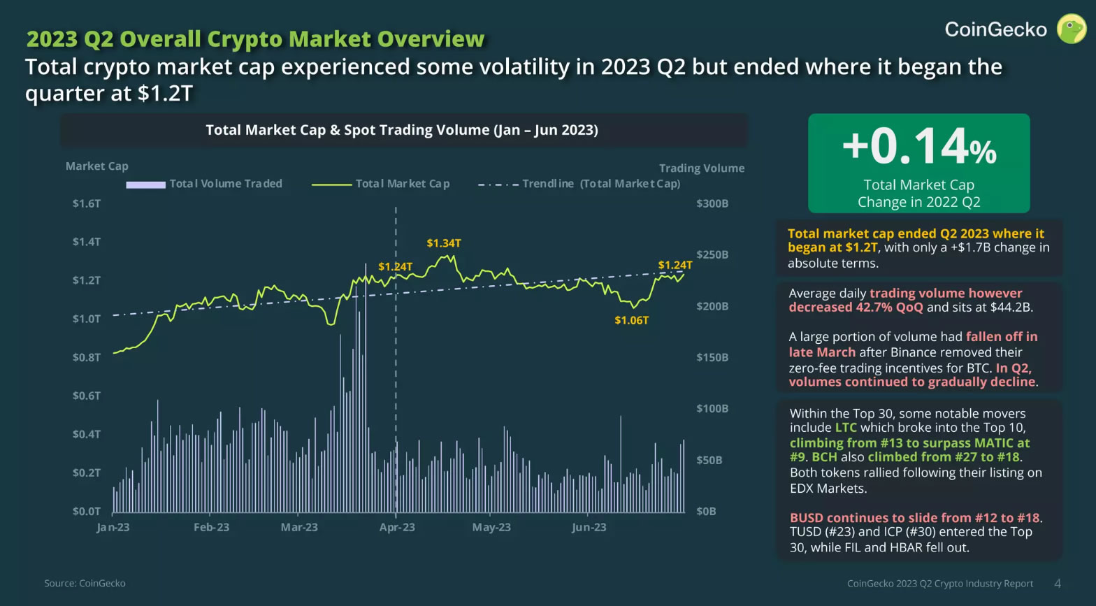CoinGecko reported the total market cap remained sideways for the quarter, ending where it started the period at $1.2 trillion. It has remained sideways into the third quarter and is still at $1.2 trillion at the time of writing.