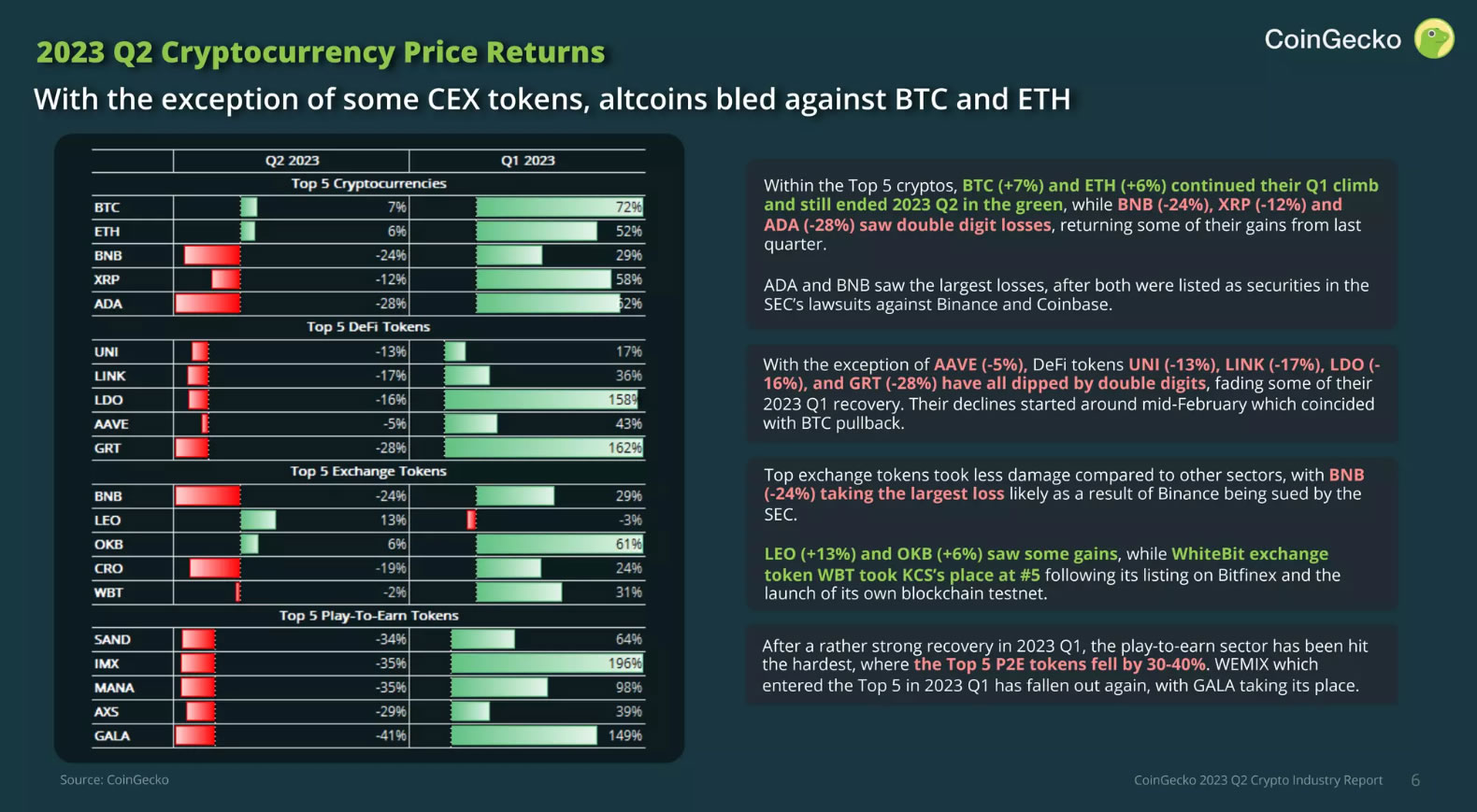 On July 18, the crypto data aggregator released its industry report for Q2 2023 which noted Bitcoin (BTC) and Ether (ETH) continued to build upon their Q1 gains over Q2.