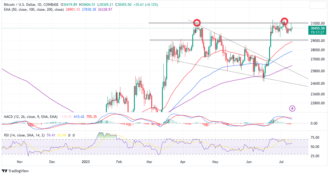 After 24 hours of an intense tug-of-war between the bulls and bears for dominance at $30,000, BTC is up 1.1% to $30,500. Bitcoin boasts $592 billion in market capitalization and $15 billion in trading volume, according to price data by CoinGecko.