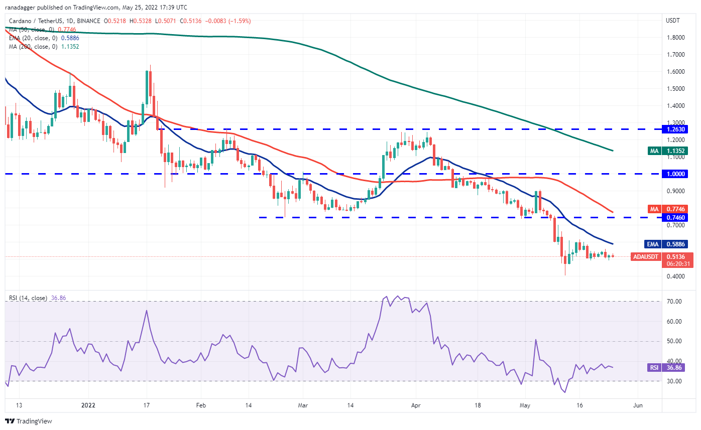 Solana’s (SOL) attempt to rally on May 23 fizzled out at $54. The failure of the bulls to push the price to the 20-day EMA ($58) indicates that demand dries up at higher levels.
