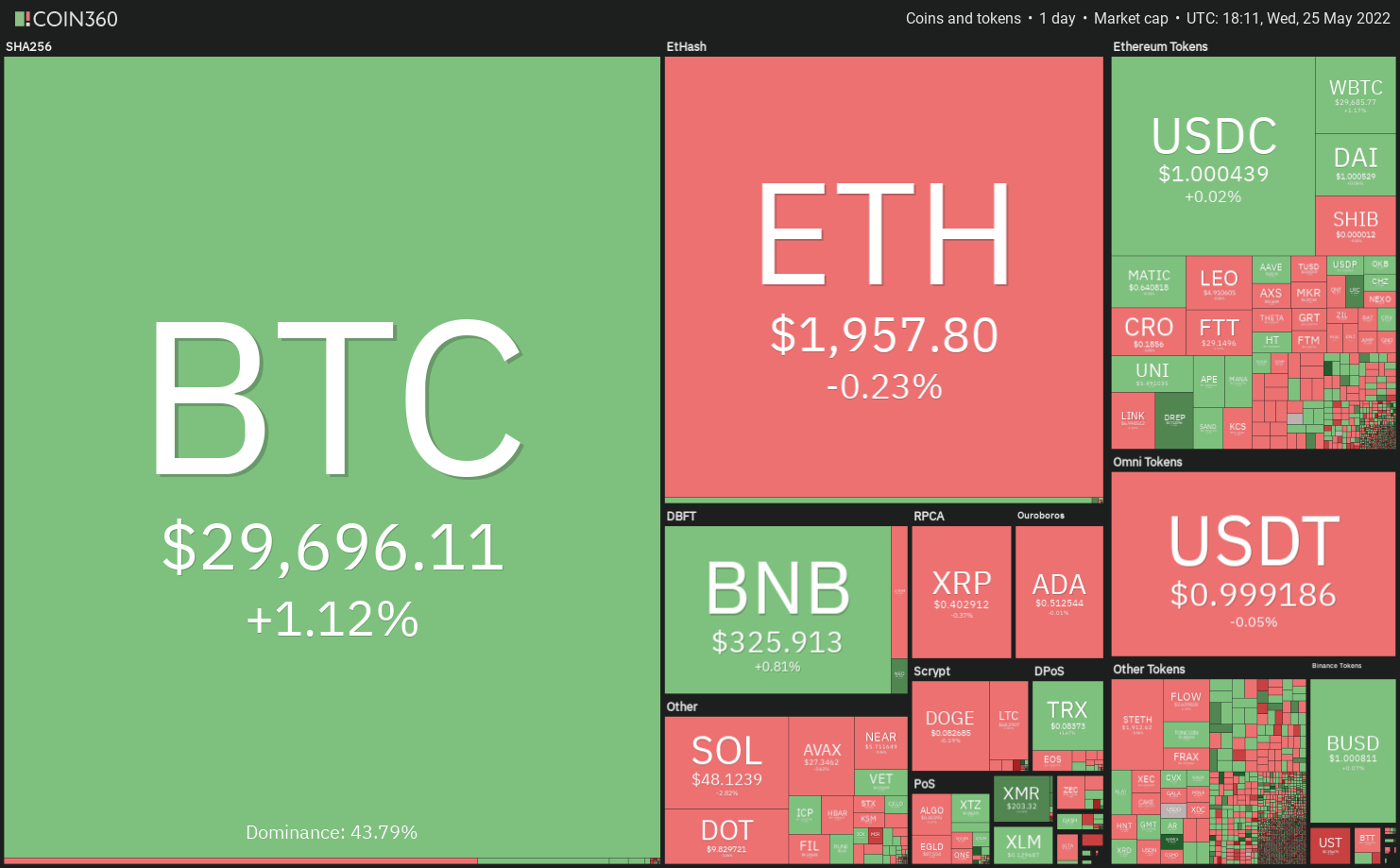 BNB climbed above the 20-day EMA ($323) on May 24 but the long wick on the May 25 candlestick suggests that the bears are attempting to defend the overhead resistance at $350.