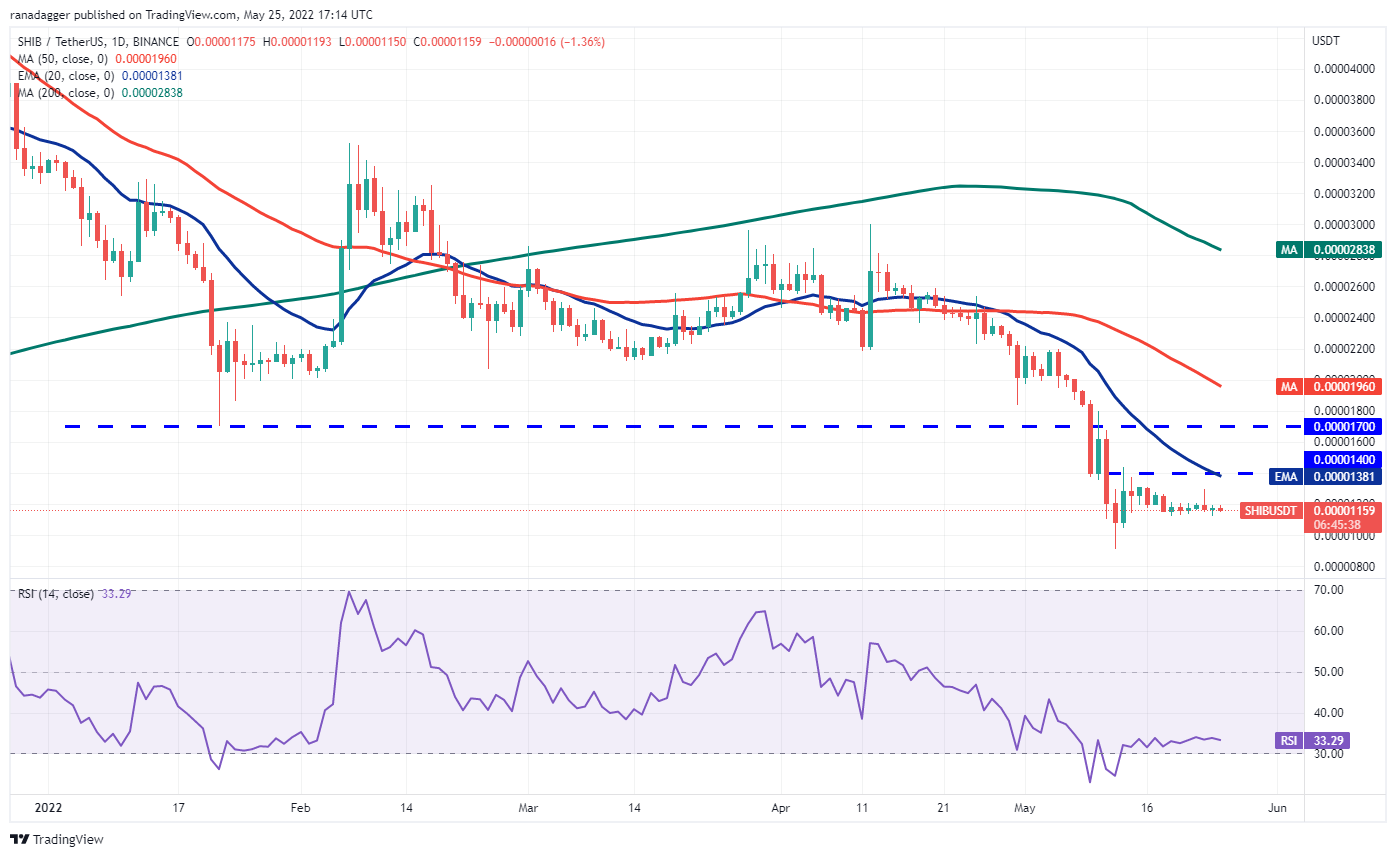 The failure of the bulls to push the price higher could attract selling by aggressive bears who will try to pull the SHIB/USDT pair below the immediate support at $0.000010. If they manage to do that, the pair could slide to the May 12 intraday low at $0.000009.