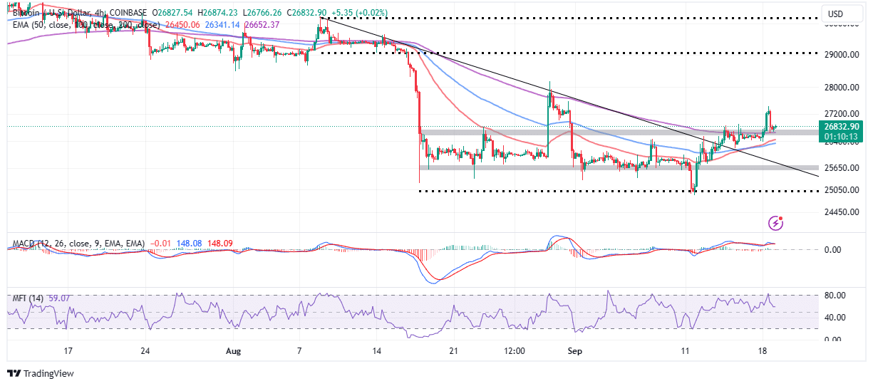 The 50-day EMA (red) and the 100-day EMA (blue) are in line to provide support at $26,448 and $26,340 in the event Bitcoin is rejected from the $27,000 resistance.