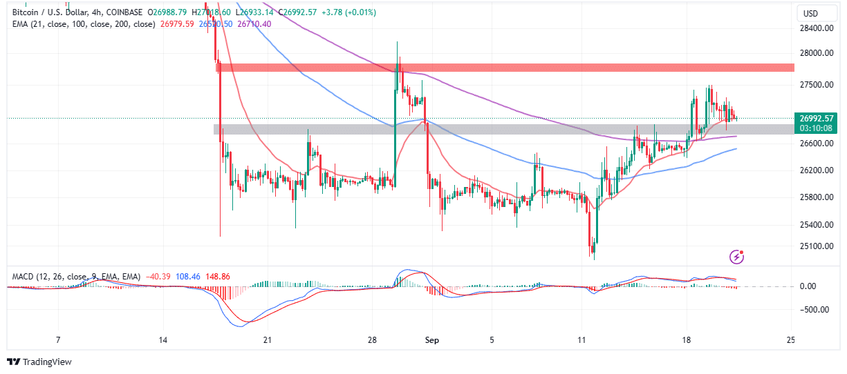 Bitcoin price is struggling to uphold its position at $27,000 support in the wake of the Federal Open Market Committee (FOMC) meeting, which as expected left interest rates unchanged for September.
