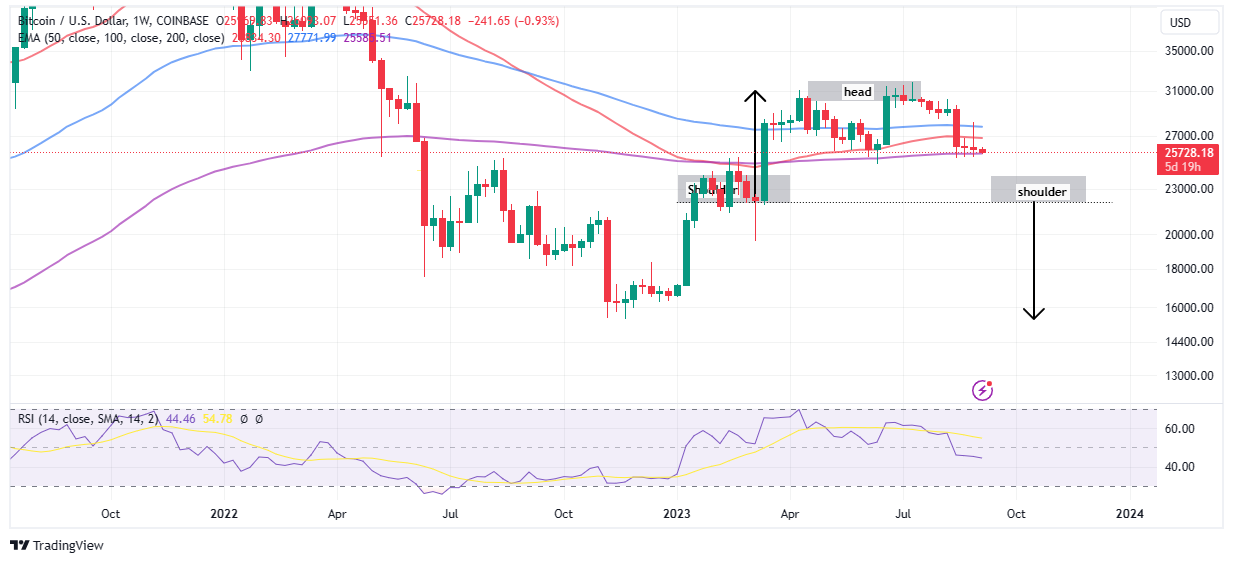 Bitcoin is in the process of forming a head and shoulders (H&S) pattern on the weekly timeframe chart, which may lead to the confirmation of a much lower bottom price point before the bull run comes.
