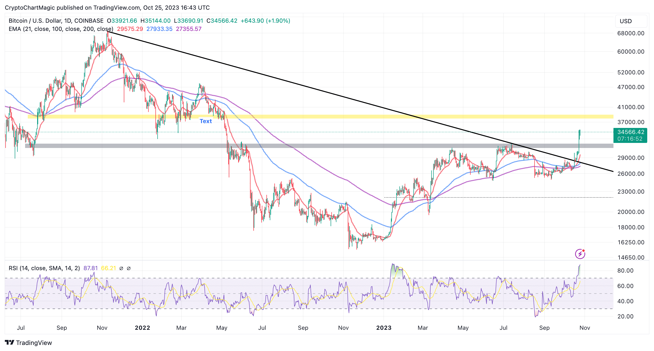 Bitcoin (BTC) price rally is back on track after taking a brief breather on Tuesday. The largest cryptocurrency hit a new milestone this week with highs slightly above $35,000 for the first time in 2023 and with support at $33,000, traders have been persistently booking new positions anticipating another breakout above $35,000.