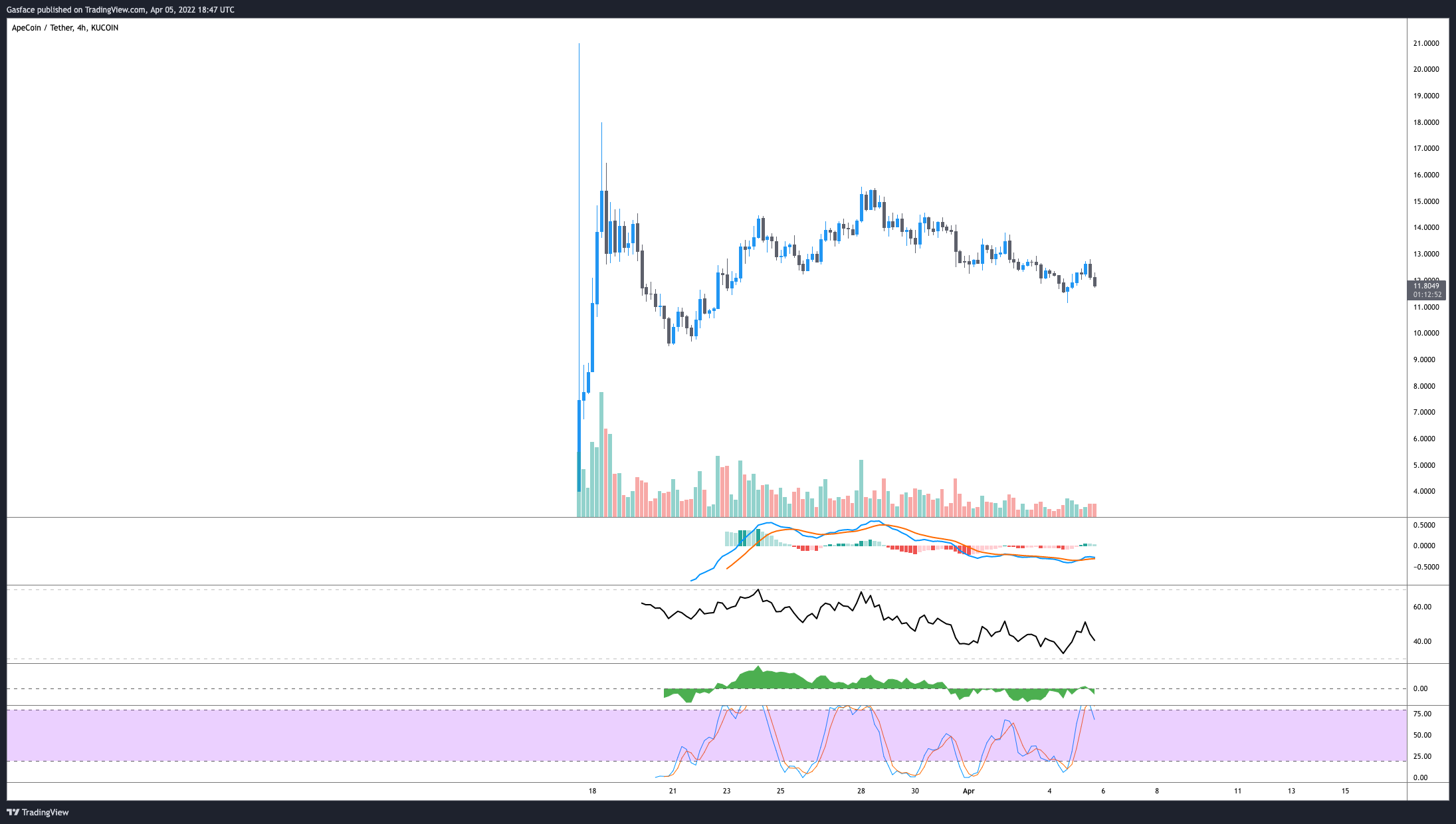 Currently, APEs total market cap is nearly $3.4 billion and there are approximately 169 million tokens in circulation out of 1 billion total. Up over 95% from its all-time low, APE is currently trading at $12.05.