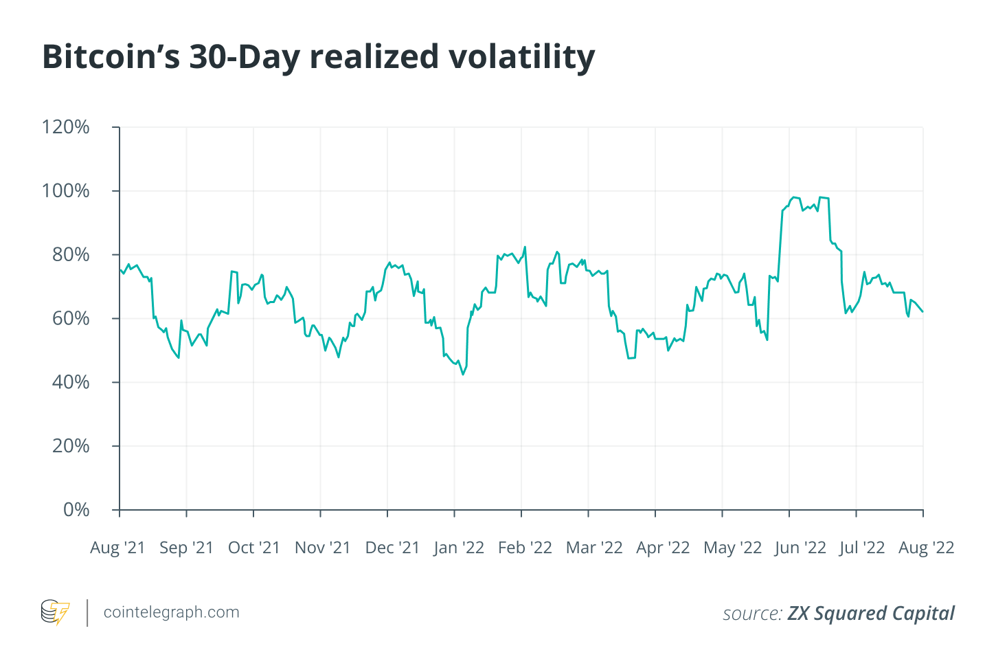 According to CK Zheng, partner and chief investment officer for crypto hedge fund ZX Squared Capital, when examining Bitcoin’s 30-day realized volatility over the last twelve months, one can see that it has continued to range between 40% to 100%, staying at an average of around 70%. Realized volatility refers to the variation in returns associated, calculated by analyzing its historical returns within a defined time period.