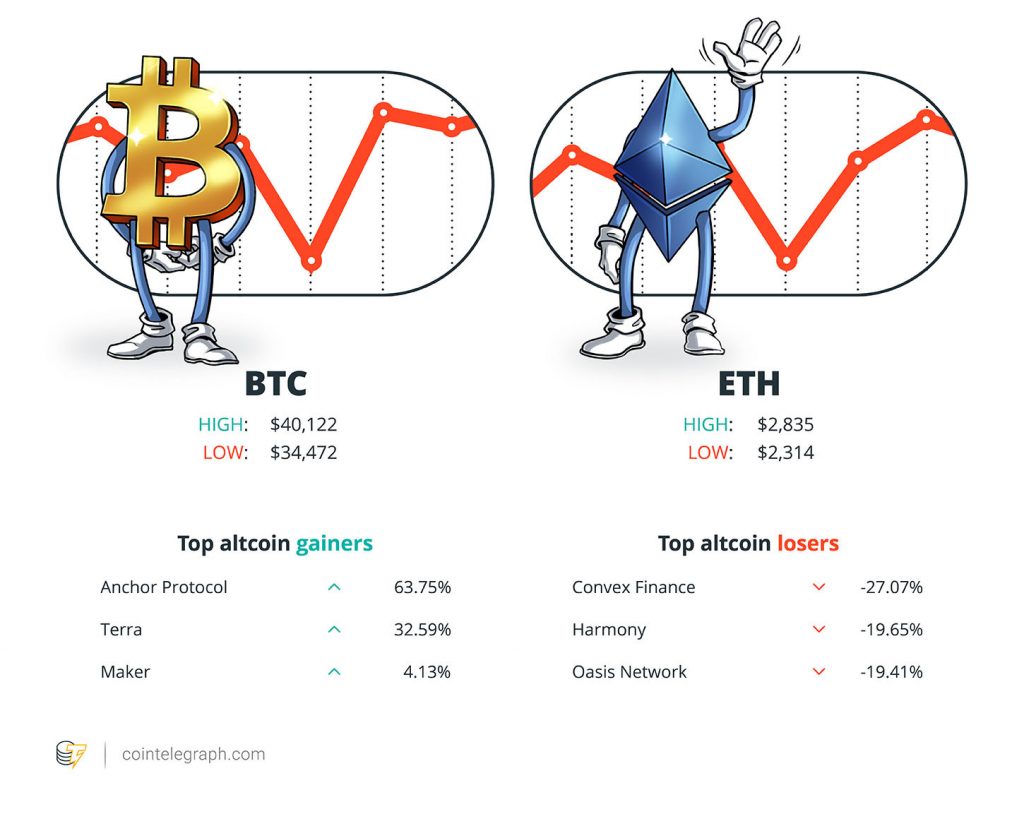 Among the largest 100 cryptocurrencies, the top three altcoin gainers of the week are Anchor Protocol (ANC) at 63.75%, Terra (LUNA) at 32.59% and Maker (MKR) at 4.13%.