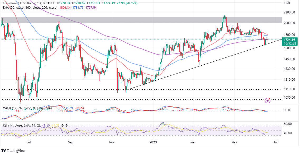 Ethereum price is trading at $1,725 while holding onto short-term support, highlighted by the 200-day Exponential Moving Average (EMA) (in purple). A glance at the daily chart affirms the bulls’ steadiness above a credible ascending trendline.