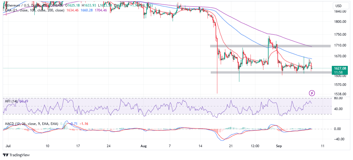 ETH price, although rangebound between support at $1,600 and resistance at $1,700, shows signs of an upcoming trend reversal. An earlier attempt to steady the bullish outlook came to a sudden halt, with Ethereum retracing to confirm short-term support at $1,600.