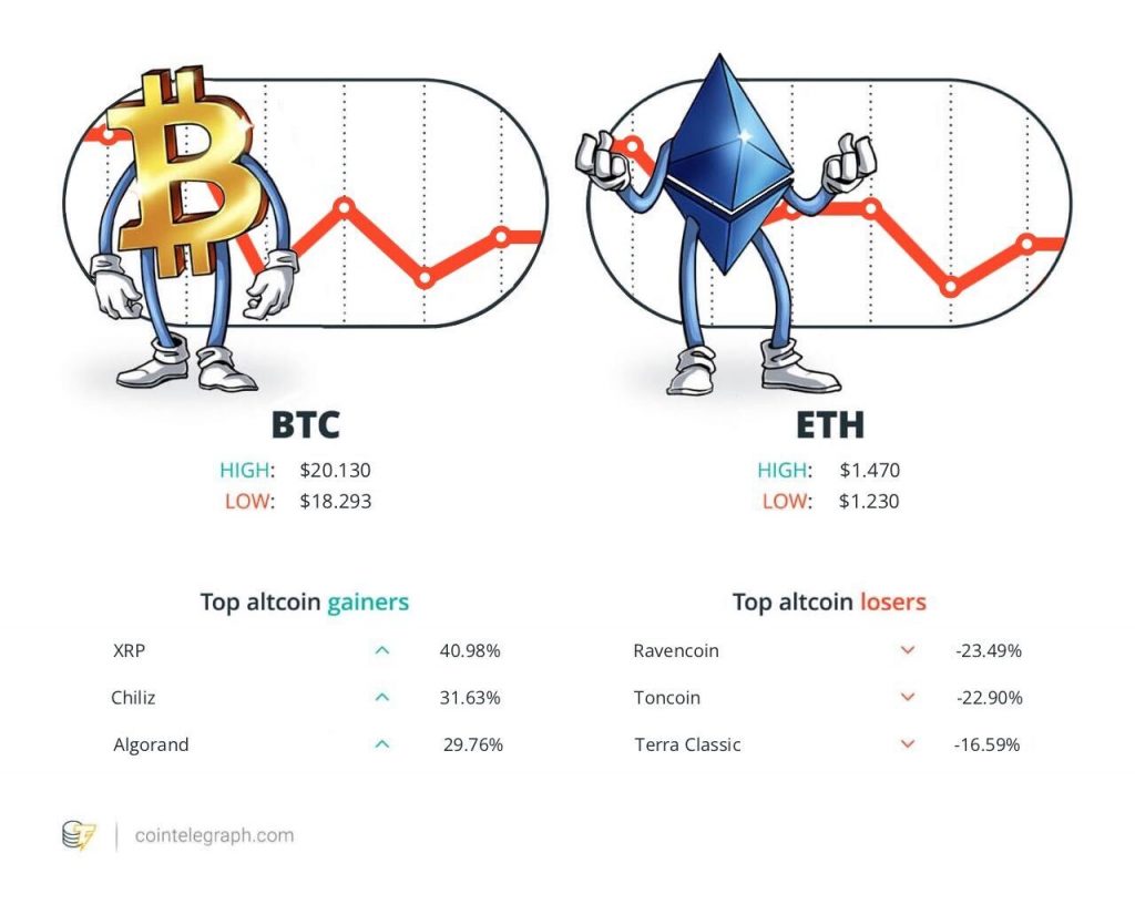 At the end of the week, Bitcoin (BTC) is at $18,800, Ether (ETH) at $1,296 and XRP at $0.47. The total market cap is at $923.34 billion, according to CoinMarketCap.
