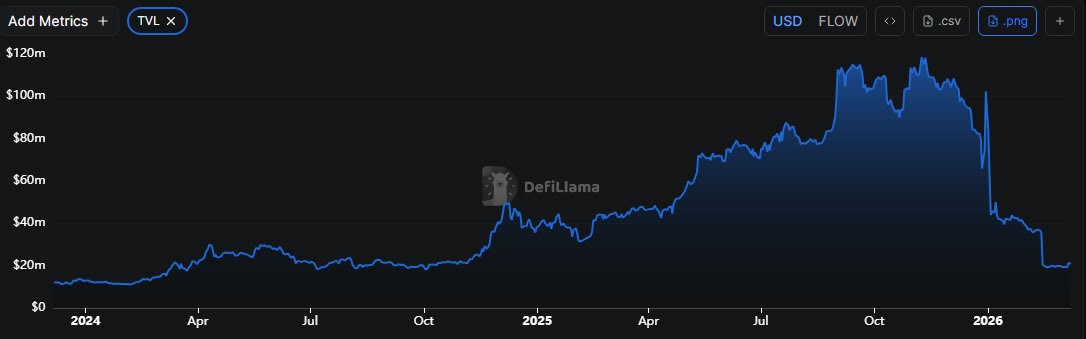 FLOW is down 99.9% from its 2021 all-time high when it reached $42, according to CoinGecko. Total value locked on the platform is down 82% to $21 million since its November 2025 peak, reports DeFiLlama.