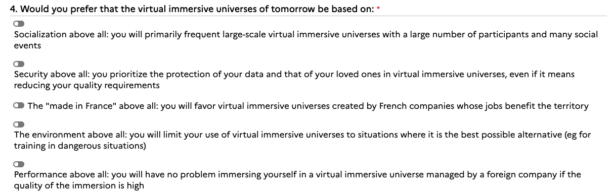 Citizens are being questioned on their experience with technologies such as mixed reality, blockchain and 3D creation software, as well as their primary concerns and intentions to engage in virtual immersive activities in the future.