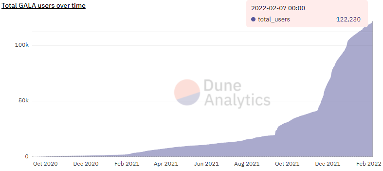 According to data from Dune Analytics, the total number of GALA users stood at 122,230 on Feb. 7, a figure that has tripled since Nov. 7, 2021, from 40,380 users.