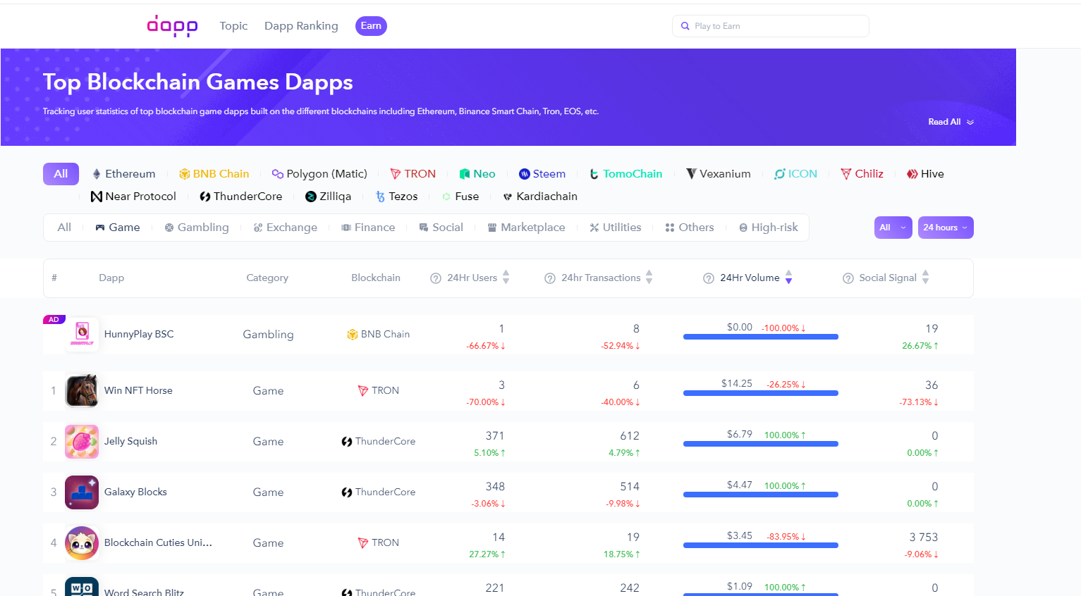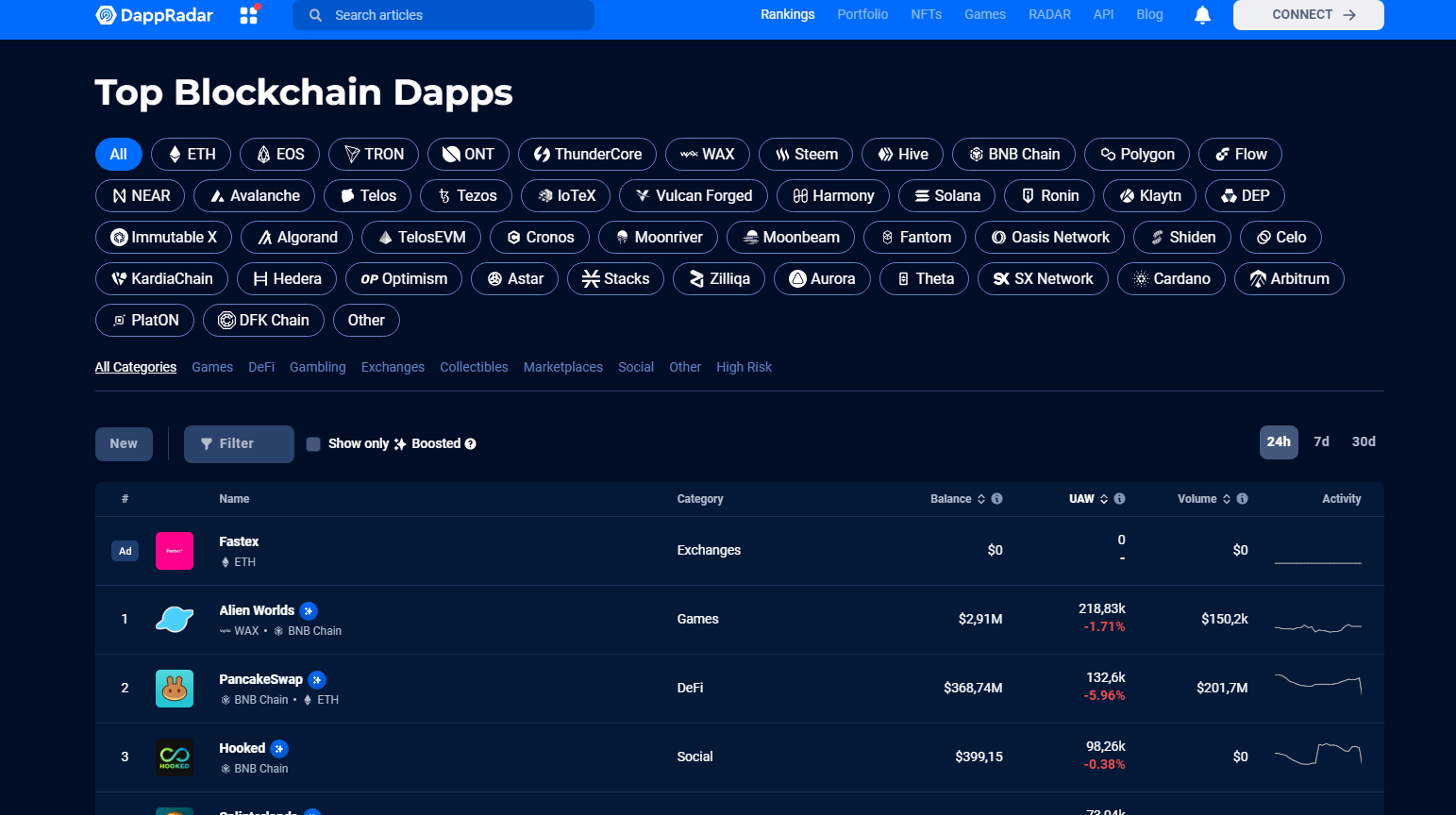 One of the most popular features of DappRadar is located in the “rankings” tab, which allows users to rank several DApps related to GameFi, DeFi projects, gambling, exchanges, NFT collections, marketplaces, social networks and different blockchains. DApps are ranked according to criteria such as the number of unique active wallets (UAW), number of transactions, transaction volume and the total balance of funds in the smart contract.