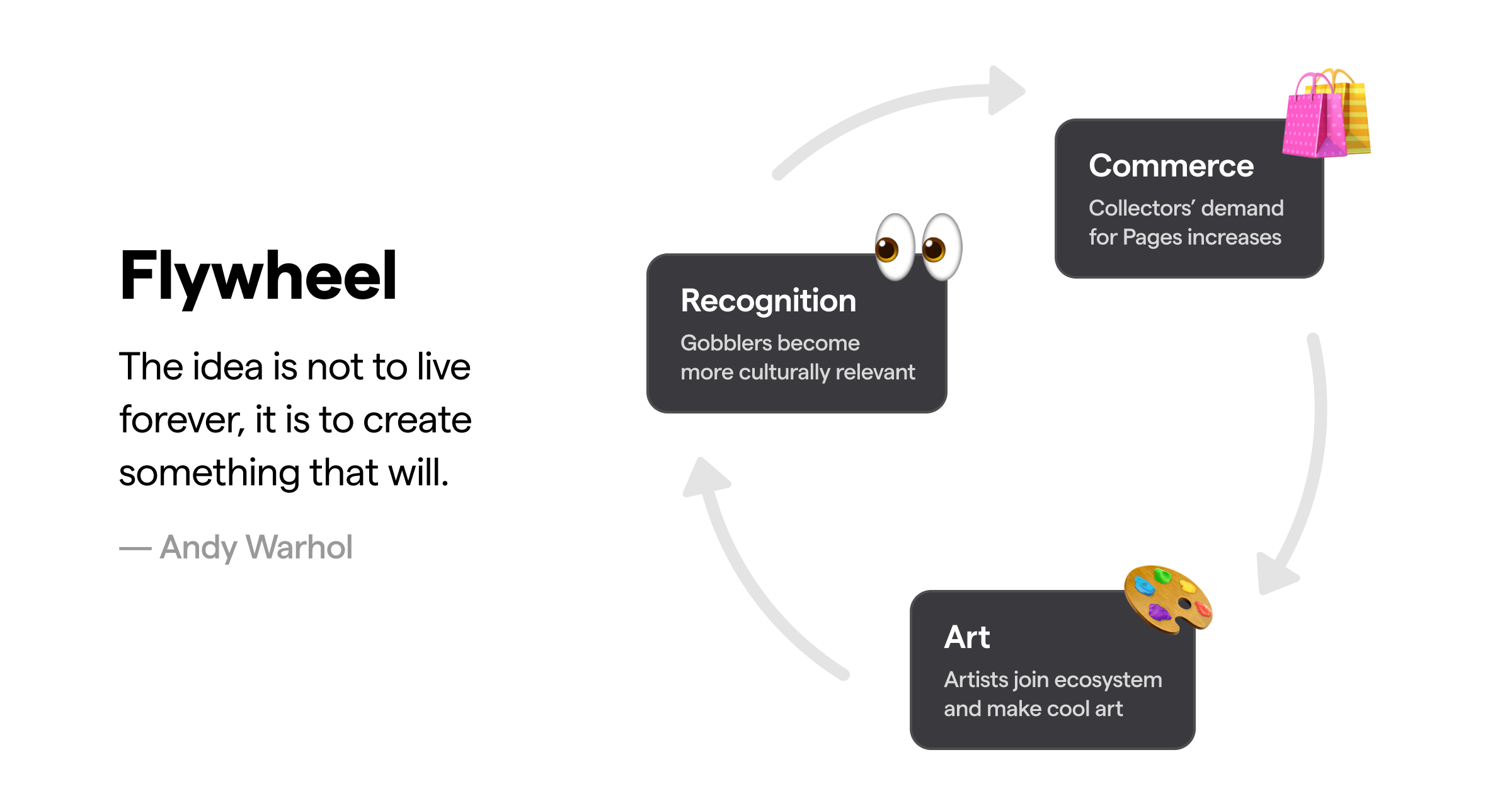 According to a Paradigm overview, the Art Gobblers ecosystem is intended to work by financially incentivizing artists and collectors in a feedback loop for both to contribute to the project, either with better art, or more money.