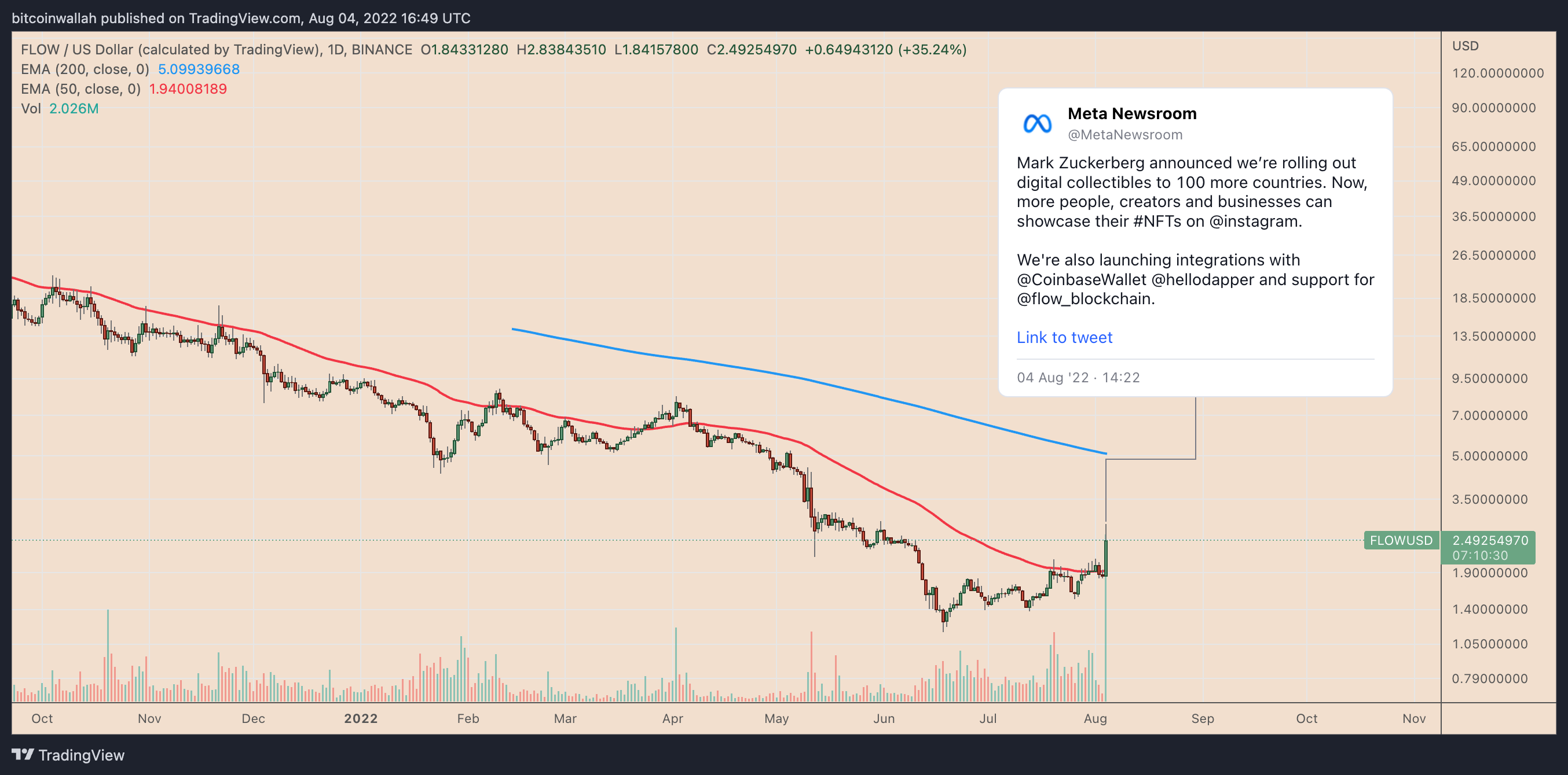 Flow (FLOW) logged its best daily performance on Aug.4 after becoming the latest blockchain to support Instagram’s nonfungible token (NFT) features.