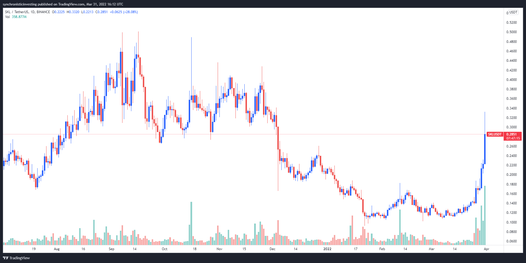 Data from Cointelegraph Markets Pro and TradingView shows that the price of SKL blasted 141% from a low of $0.1374 on March 25 to an intraday high of $0.3322 on March 31 amidst a 100% spike in its 24-hour trading volume.
