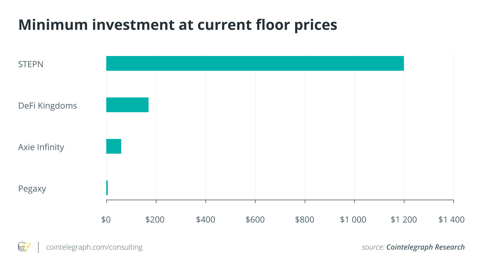 However, for the average Axie Infinity player, STEPN is not a cheap game to play. Sure, the cost of one Axie was, perhaps, a couple of hundred United States dollars in 2020, which translates to roughly $600 to build a team and start playing. But now the bottom price for an Axie is less than $20. With STEPN, on the other hand, the average floor price of a sneaker, according to Solana NFT marketplace Magic Eden, is 13.67 SOL, or roughly $1,400, at the time of writing. Compared to STEPN, other popular P2E games also don’t cost as much to start playing.