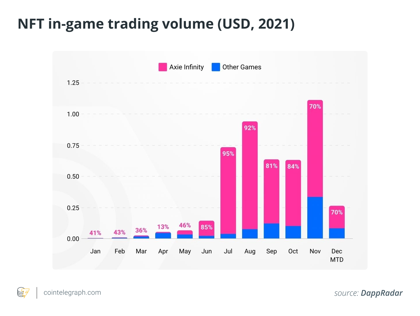 The daily active users of the game grew from 20,000 users in March of this year to 2.5 million users in December of this year, marking a 125x increase in less than nine months — a remarkable feat for a game that gained hype only this year. The game has recorded $9.72 million in a single day in June, surpassing a record Tencent held at the time. In the third quarter of 2021, the game accounted for 19.5% of the total NFT trading volume in the same period and $2.08 billion of trading volumes.