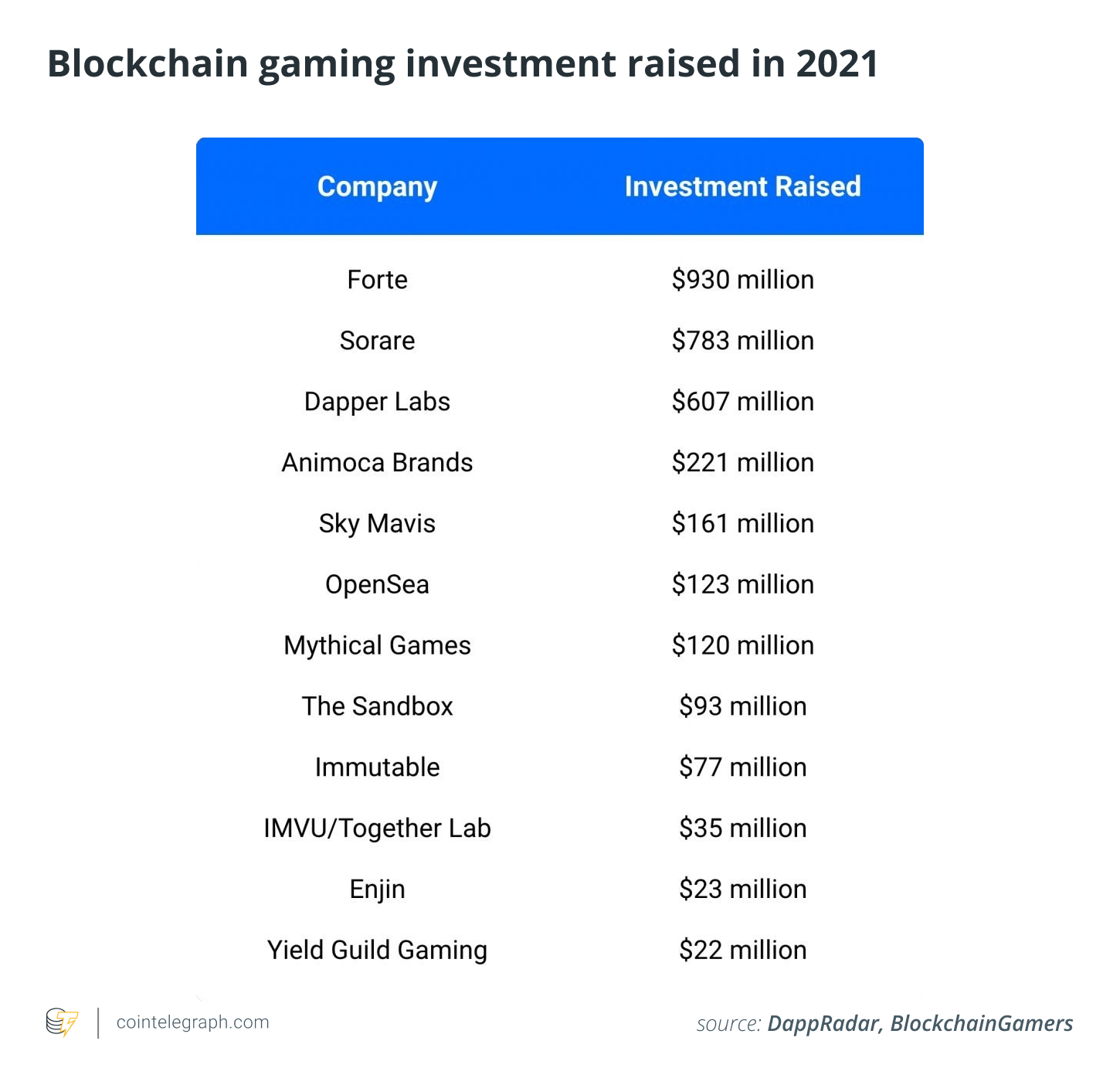 The investment raised with the blockchain gaming domain has well surpassed over a billion dollars in 2021, led by the $930 million raised by the gaming company Forte Labs.