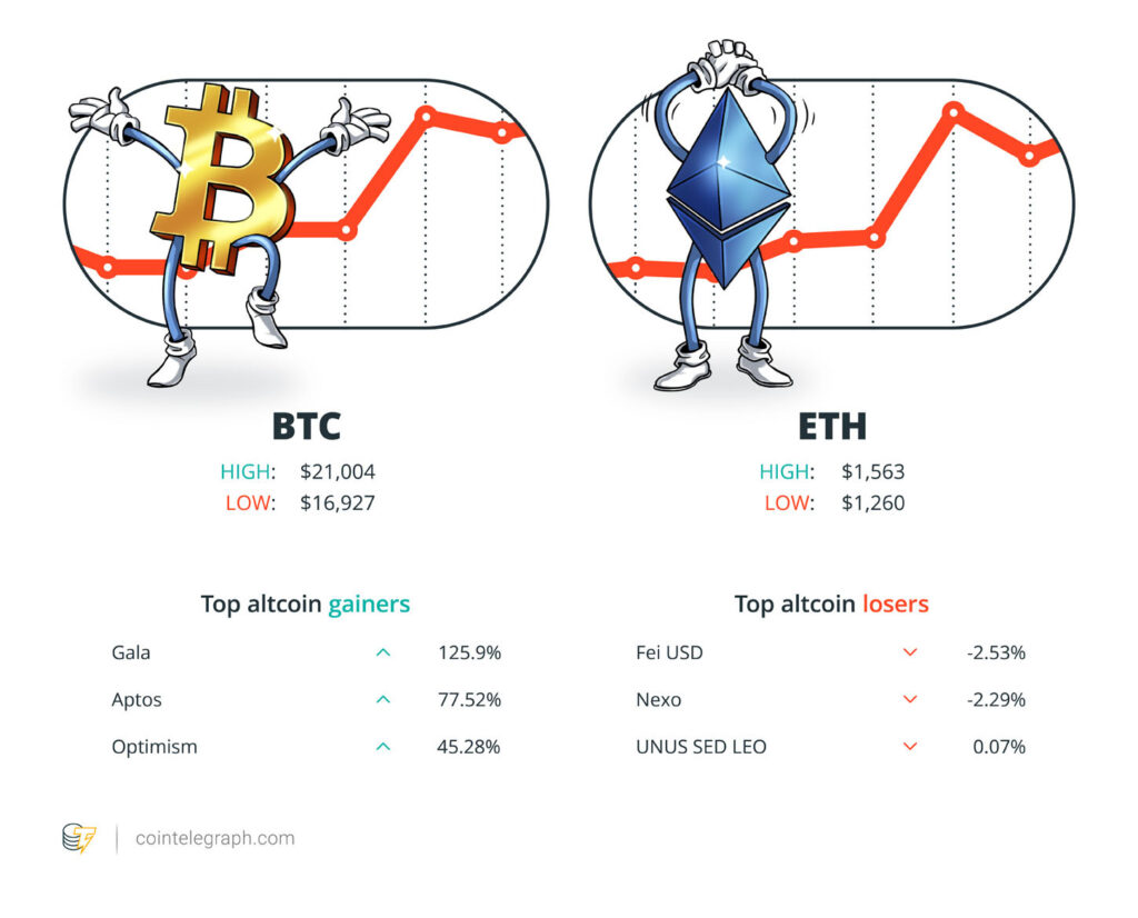 Among the biggest 100 cryptocurrencies, the top three altcoin gainers of the week are Gala (GALA) at 125.9%, Aptos (APT) at 77.52% and Optimism (OP) at 45.28%.