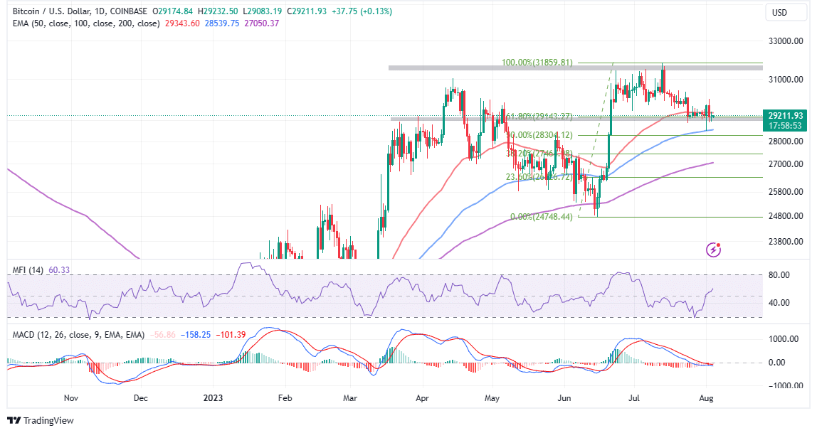 Meanwhile, support at $29,100 has been reinforced by the 61.8% Fibonacci level, and with the Money Flow Index (MFI) moving above the midline, the path with the least resistance could to the upside.