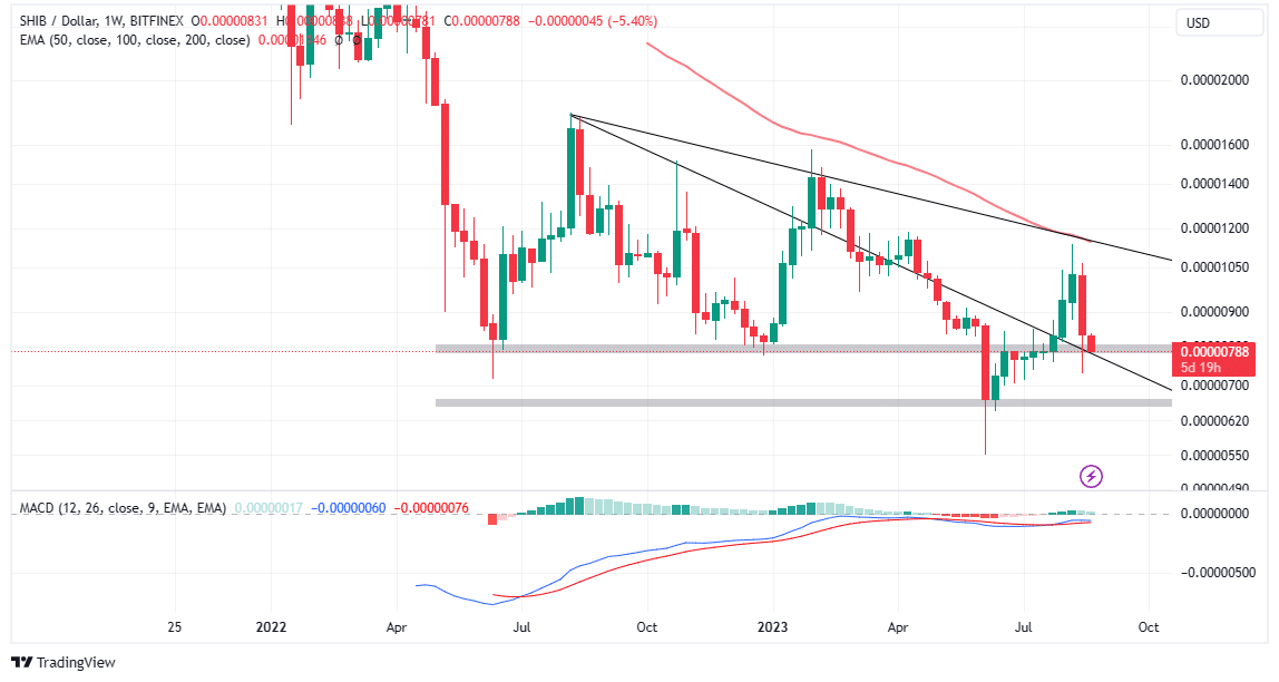 Shiba Inu is trading at $0.00000791 at the time of writing after facing rejection from a four-month high of $0.00001135 on August 12.