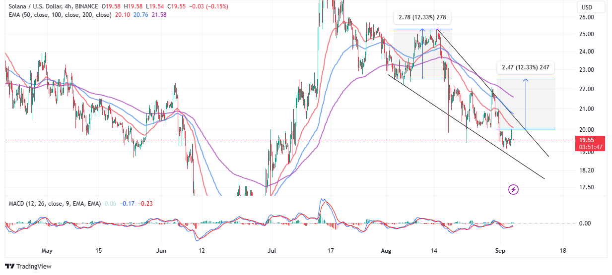 A falling wedge pattern on the four-hour chart hints at a 12% breakout to $22.5, This pattern serves as hope that the downtrend is coming to an end and bulls are ready to take over. Two downward-slopping trendlines form this pattern, one connecting the series of lower highs and the other the lower lows.