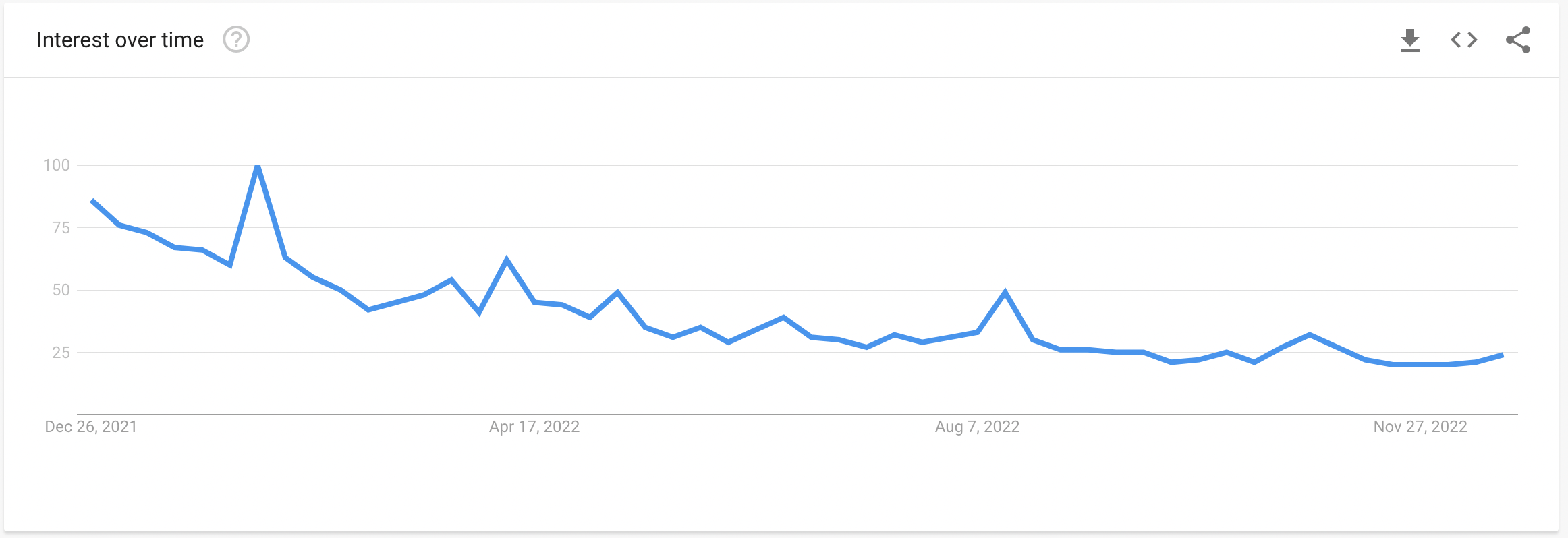 The second-largest blockchain by market cap stayed in the news throughout the year due to its switch to proof-of-stake (PoS) from proof-of-work (PoW) via the Merge. Notably, interest in the keyword “Ethereum” and related terms like “Ethereum 2.0” and “Merge” peaked in September when the PoS switch happened.