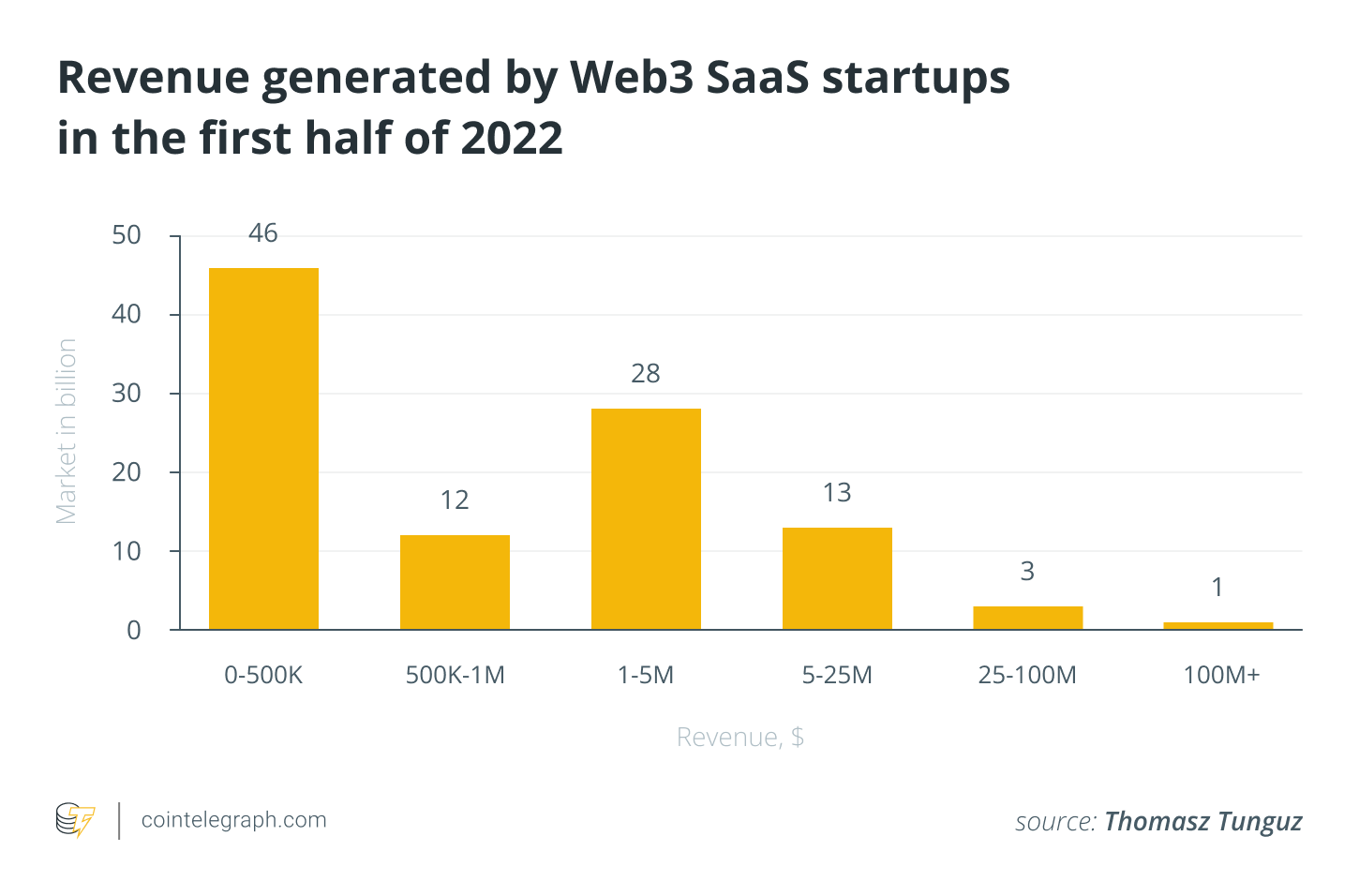 One attempt by venture capitalist Tomasz Tunguz to size up the total addressable B2B SaaS3 market calculated that 57 Web3 SaaS projects generated revenue ranging from $500,000 to above $100 million in the second half of 2022. The on-chain revenue of Web3 startups, largely dominated by Ethereum, indicates a total addressable market of $231 million in 2022.