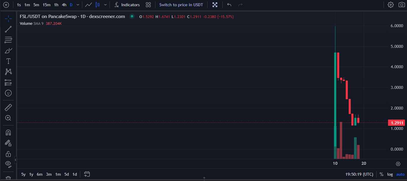 Data from DEX Screener shows that the price of FSL was initially set at $0.3911 per token on Oct. 10 at 6:30 am UTC. Over the next few hours, it rose to $17.5774, then retreated from this peak and came to stabilize at around $5 for the next few hours. Then, between 4:30 pm and 5:00 pm UTC, the price suddenly collapsed, falling from approximately $5 to near zero.