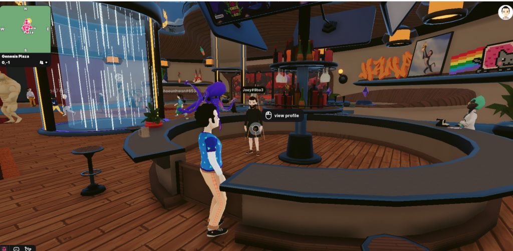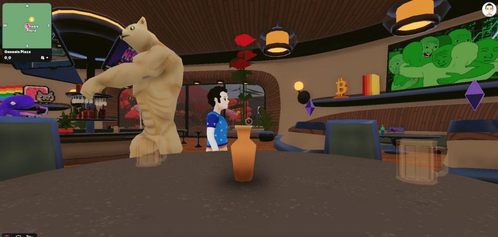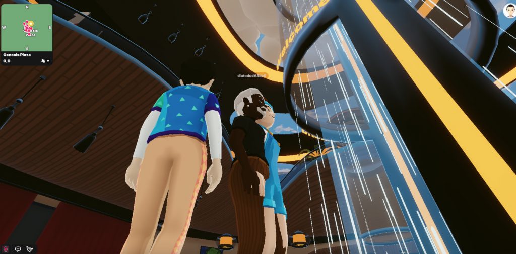 I spawn in “Genesis Plaza,” a bar in a shopping mall plaza for avatars — a bar without alcohol.