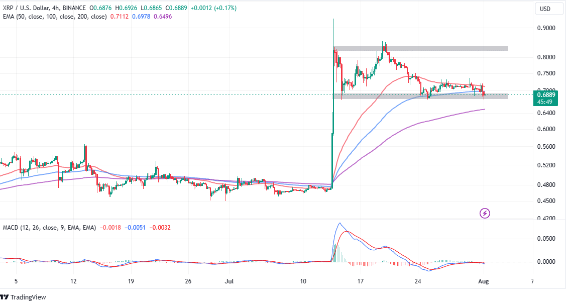 XRP price has in the last few weeks been confined in the lower range of the channel, thus putting a lot of pressure on support at $0.68. It is essential for bulls to keep this support intact, otherwise, sellers could tap sell the signal from the Moving Average Convergence Divergence (MACD) indicator.