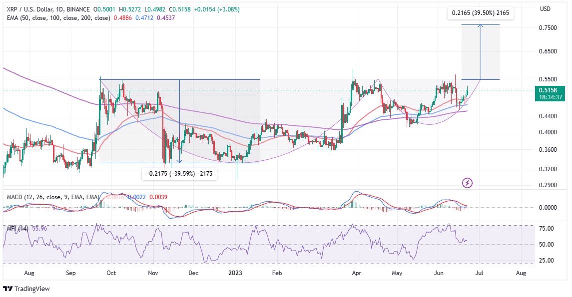 Now that XRP price has reclaimed resistance at $0.5 and is trading at $0.516 on Thursday, the path with the least resistance is to the upside. The formation of a cup and handle pattern, which CoinGape has highlighted before implies that XRP is approaching the point of no return.