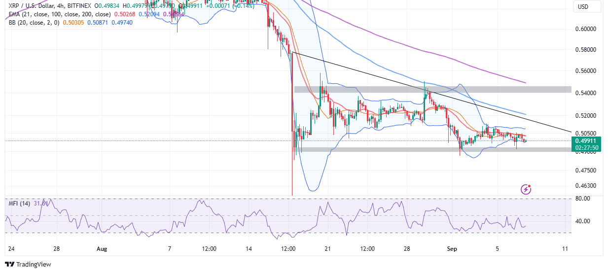XRP’s range support at $0.5 must hold for bulls to push for a trend reversal and is of great importance now that the Bollinger bands indicator is squeezing in the wake of the sell-off at the end of August.
