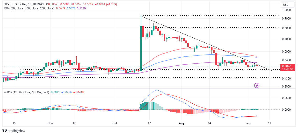 With four consecutive four-hour bearish candles, XRP price barely holds above $0.5. This level is critical for the resumption of the uptrend and, therefore, must be defended at all costs.