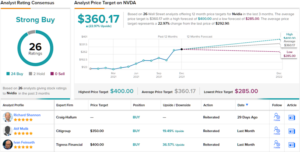 Overall, Wall Street is in broad agreement that Nvidia is a stock to buy. The shares have 26 recent reviews, including 24 Buys and just 2 Holds, supporting the Strong Buy analyst consensus rating. NVDA’s average price target of $360.17 implies an upside of ~23% in the next 12 months, from the current share price of $292.9. (See NVDA stock analysis on TipRanks)