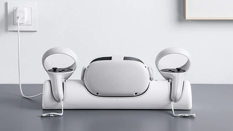 The Anker Charging Dock for Quest 2 is exactly what it sounds like. It’s a resting place for your Quest 2 head unit and controllers when you’re not using them, and includes rechargeable batteries for your controllers as well as a USB-C cable and power adapter (you plug the cable into the dock).