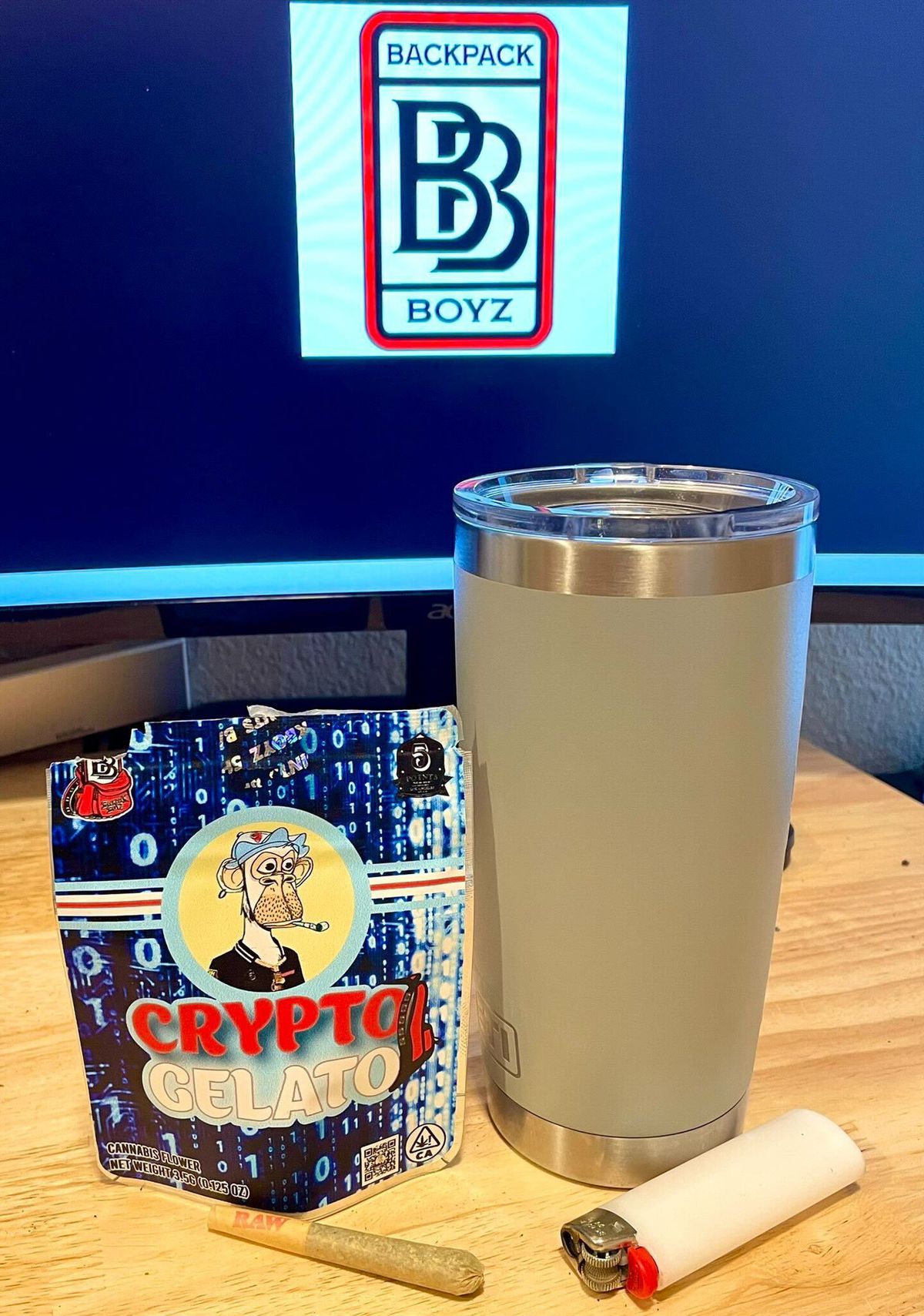The finished product was an ice blue, Matrix-style cannabis flower package with Lee’s ape emblazoned over the name of the new strain: Crypto Gelato. At that point, Backpack Boyz had been watching the NFT space only from a distance — they mostly agreed to do it, Lee thinks, as a favor for the mutual friend who made the introduction.