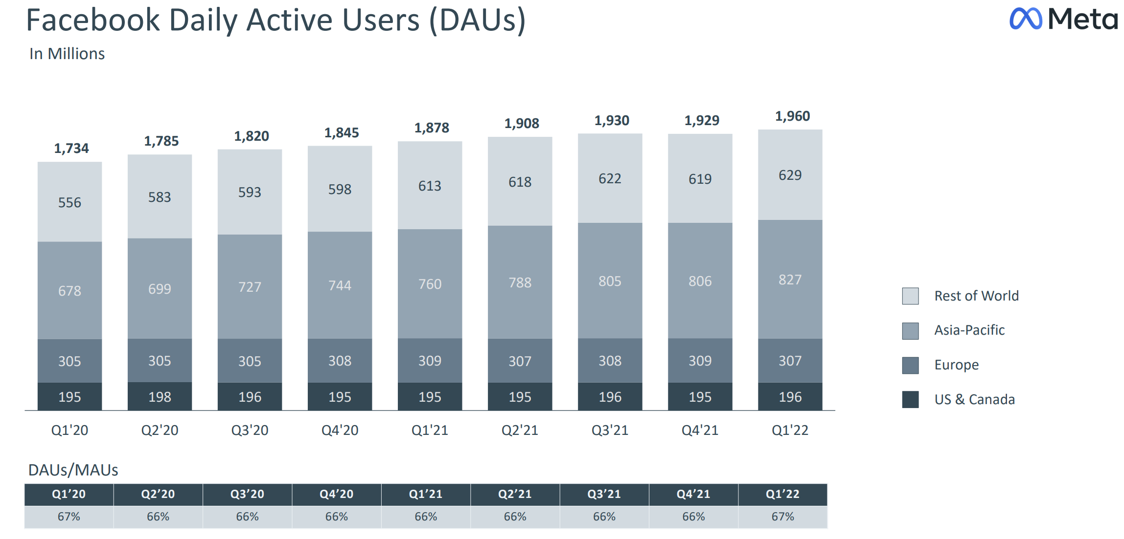 It was a mixed bag of first-quarter earnings results for Meta. Facebook DAUs, which had fallen from 1.93 billion to 1.92 billion in Q4 2021, were up to 1.96 billion in Q1 2022, beating Wall Street estimates of 1.95 billion. But the company’s total quarterly revenue of $27.91 billion missed analysts’ estimates of $28.20 billion, a 7% year-over-year growth that marks the smallest since Facebook went public a decade ago and 21% lower than a year earlier.