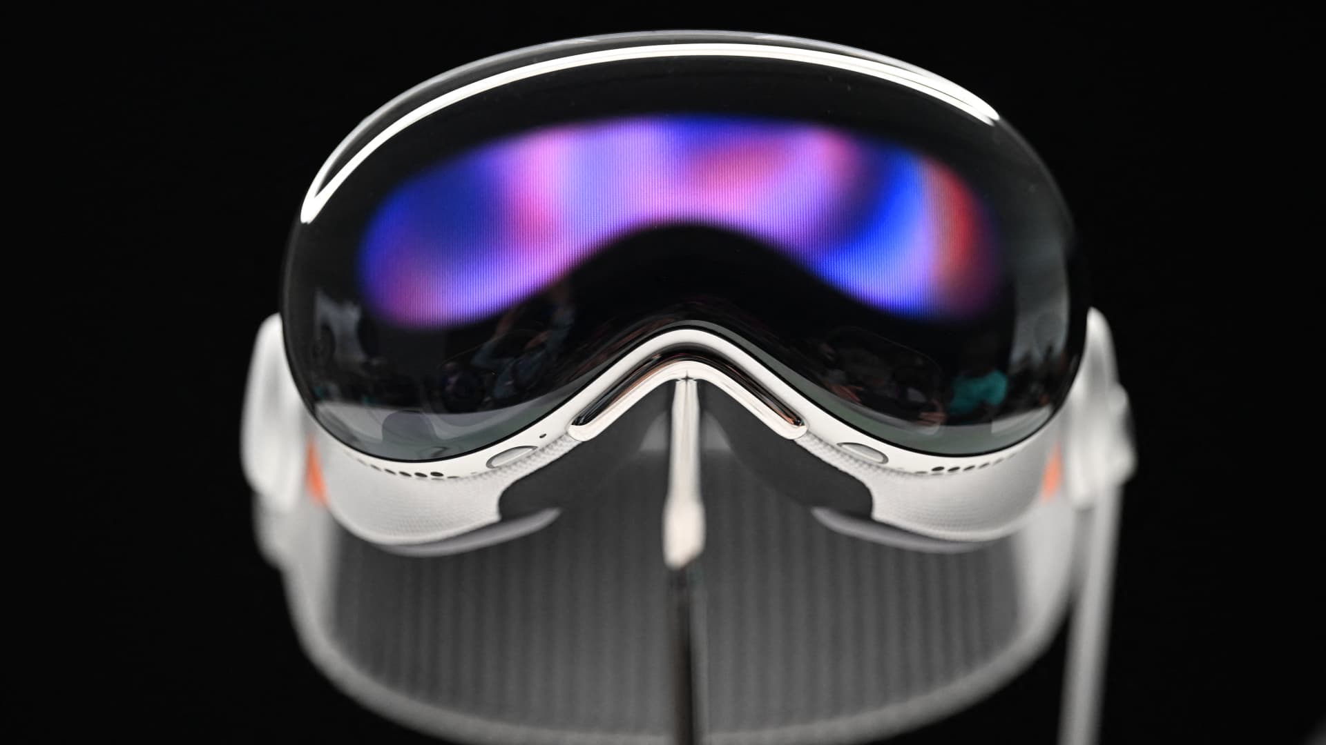 Apple’s new Vision Pro virtual reality headset is displayed during Apple’s Worldwide Developers Conference (WWDC) at the Apple Park campus in Cupertino, California, on June 5, 2023.