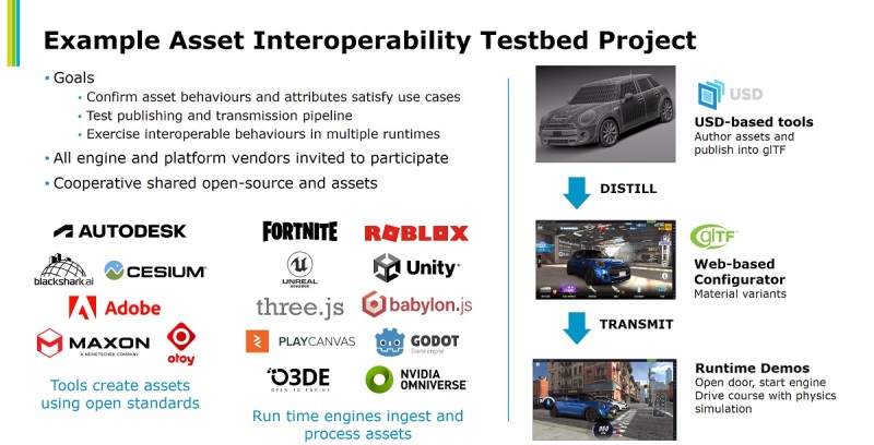 Some standards will cover different areas, such as glTF for transmission of 3D graphics over the web, compared to Universal Scene Description (USD, a standard first created by Pixar to make 3D tools compatible) for heavy-duty 3D graphics. In this case, glTF might be used for transmission and USD for authoring. And so the standards group might try to make USD and glTF work together better.