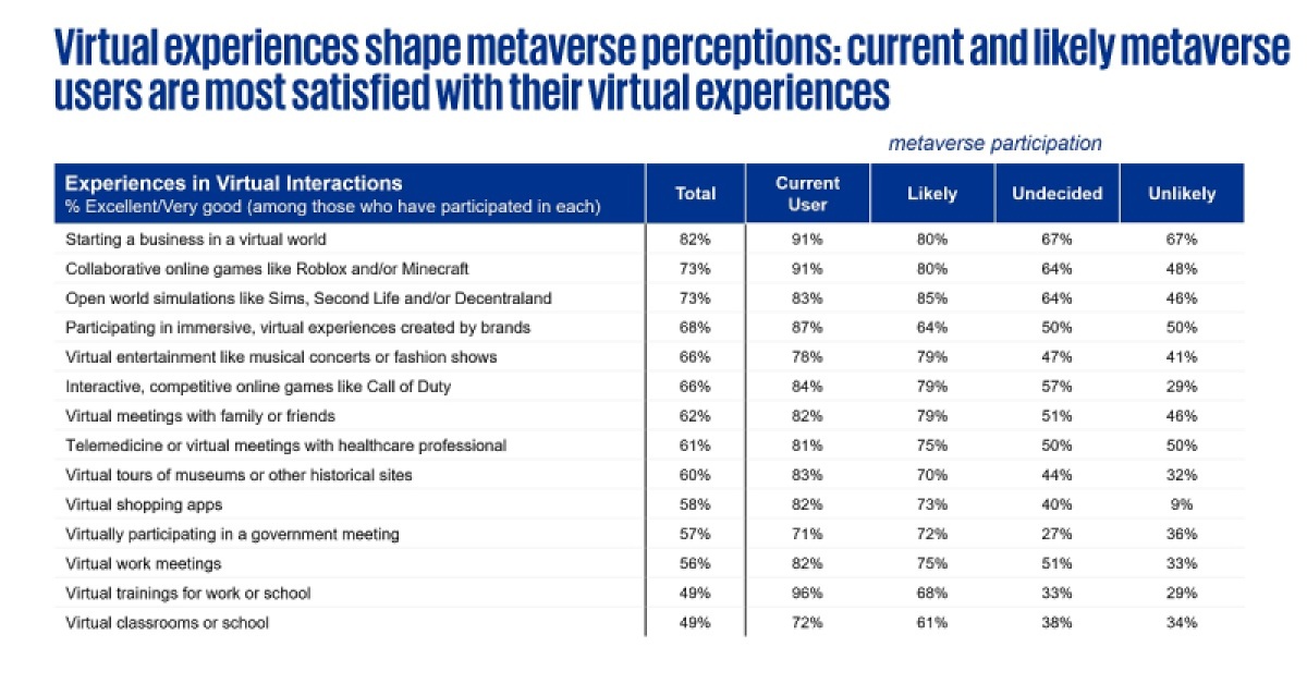 Current metaverse users also report virtual participation in trainings for work or school (96%), work meetings (82%), virtual classrooms (72%) and government meetings (71%) as top experiences.